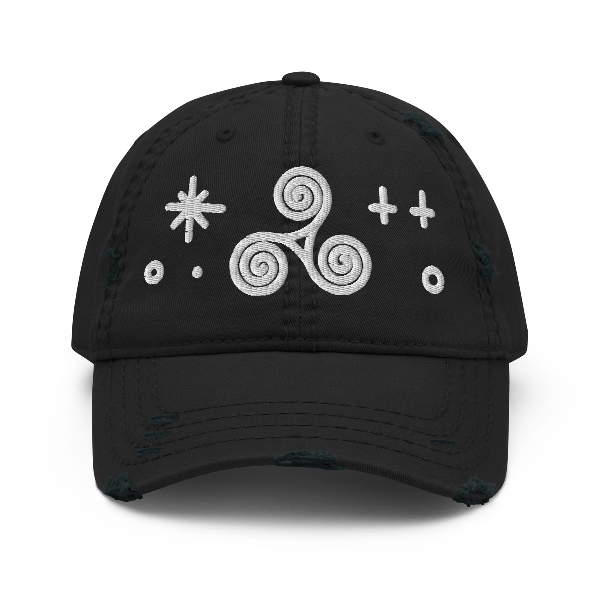 The distressed surface gives it a sense of age, as if it were something pulled from an archive or a field bag. Modern embroidery sewn onto a hat that looks like it’s already been carried through weather and miles. That contrast is the point.