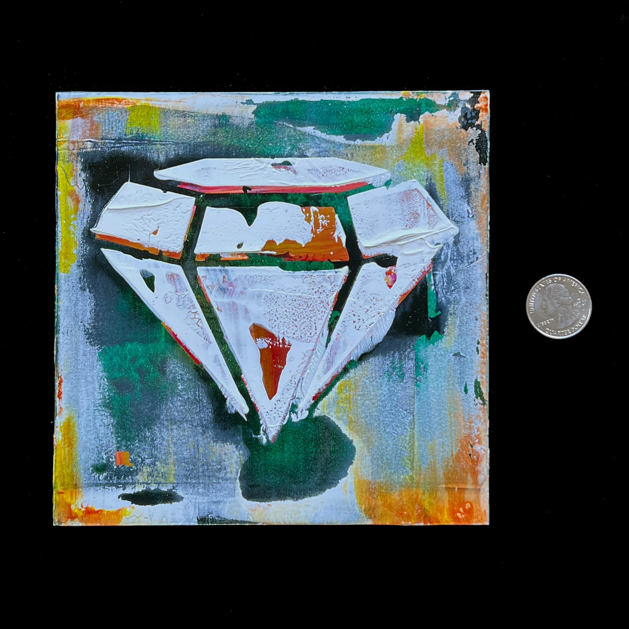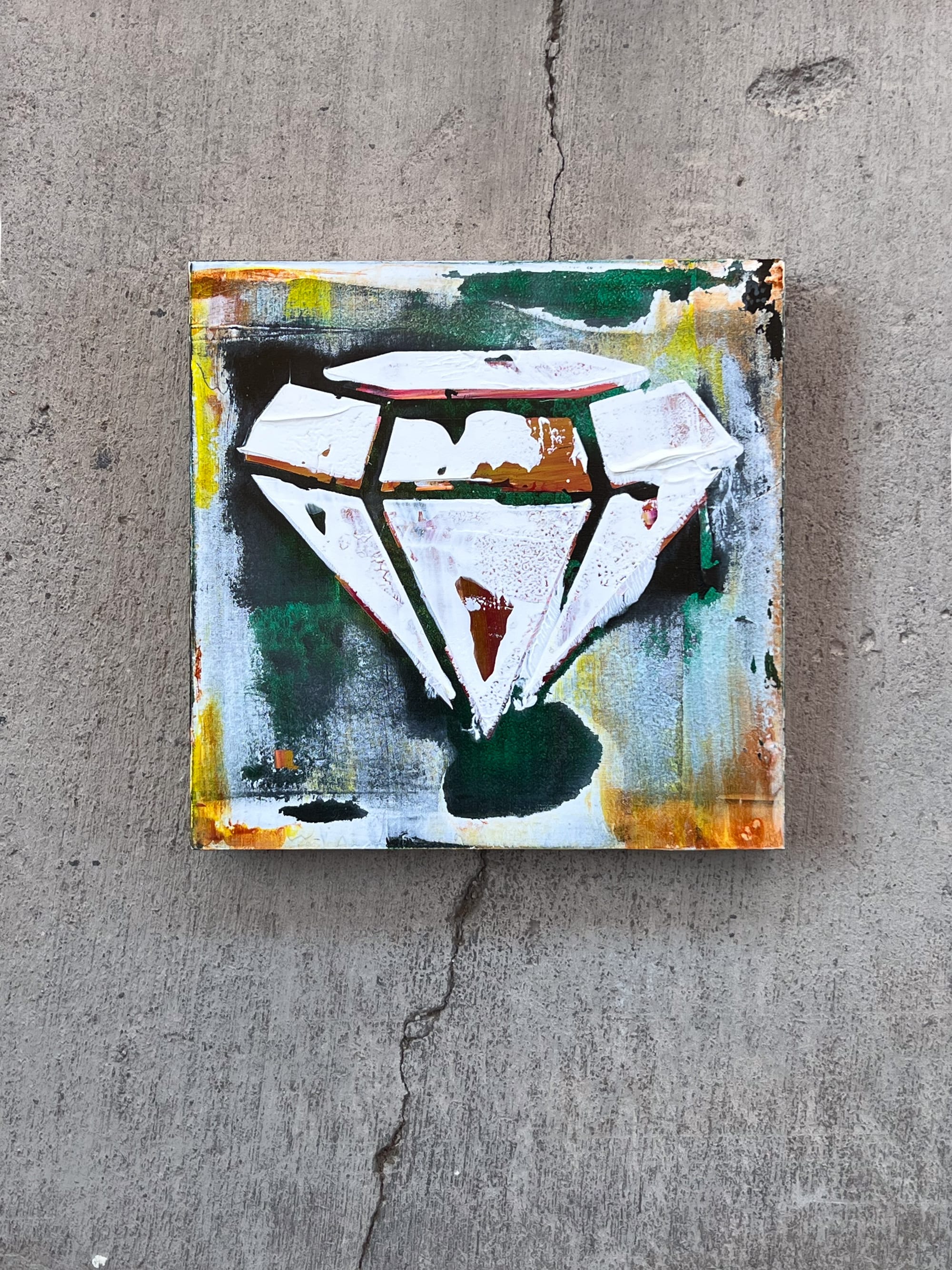 The surface is built up with heavy-body acrylics in layered gestures that resist polish, forming unexpected ridges and textures. The crisp white diamond sits against a background of scraped and blurred color—less a backdrop than a field of tension. The result feels both deliberate and accidental, mechanical and handmade, a symbol broken open to reveal grit inside.
