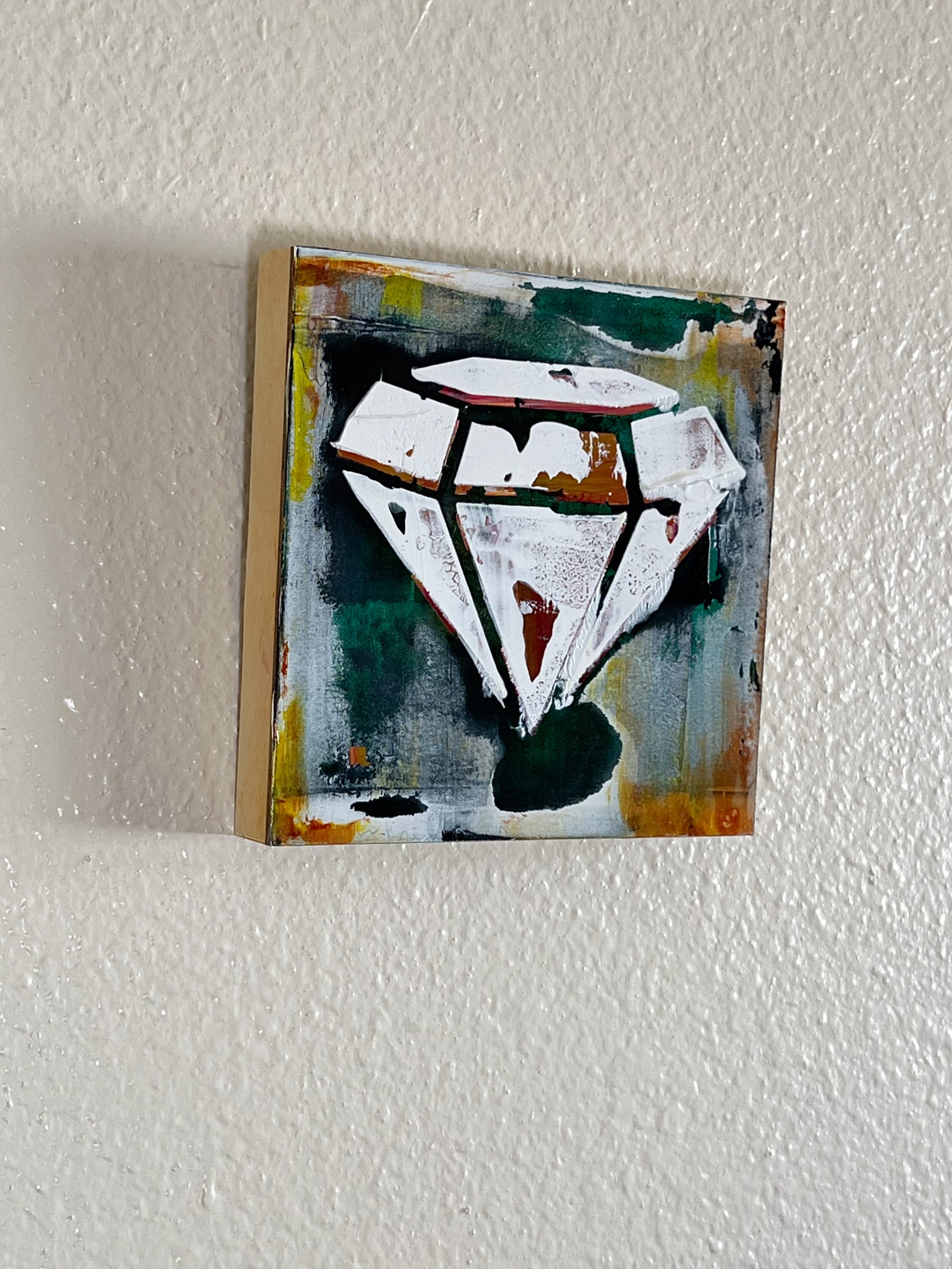 Part of a series exploring symbols reimagined, this piece fractures the image of a diamond into textured white strokes over a raw, layered field of colour.