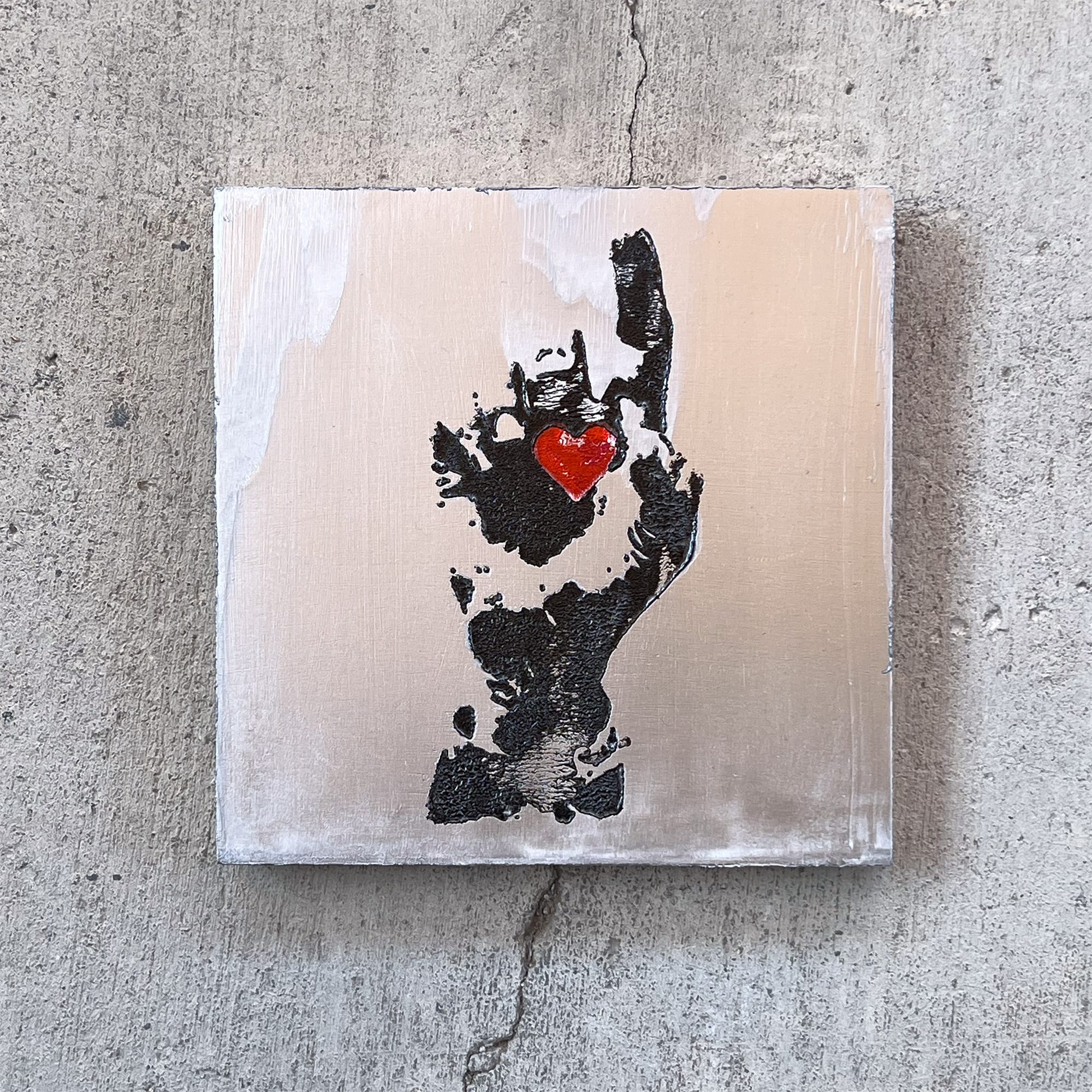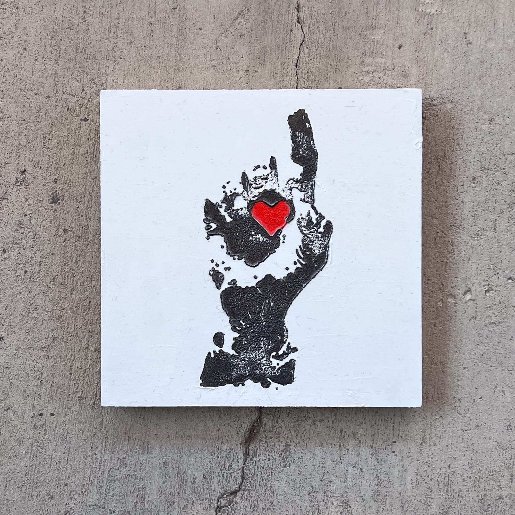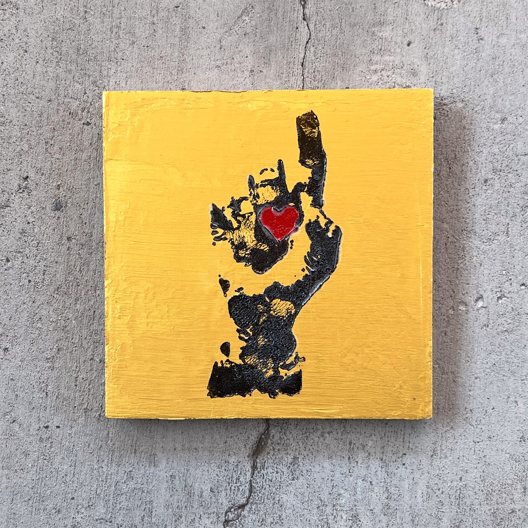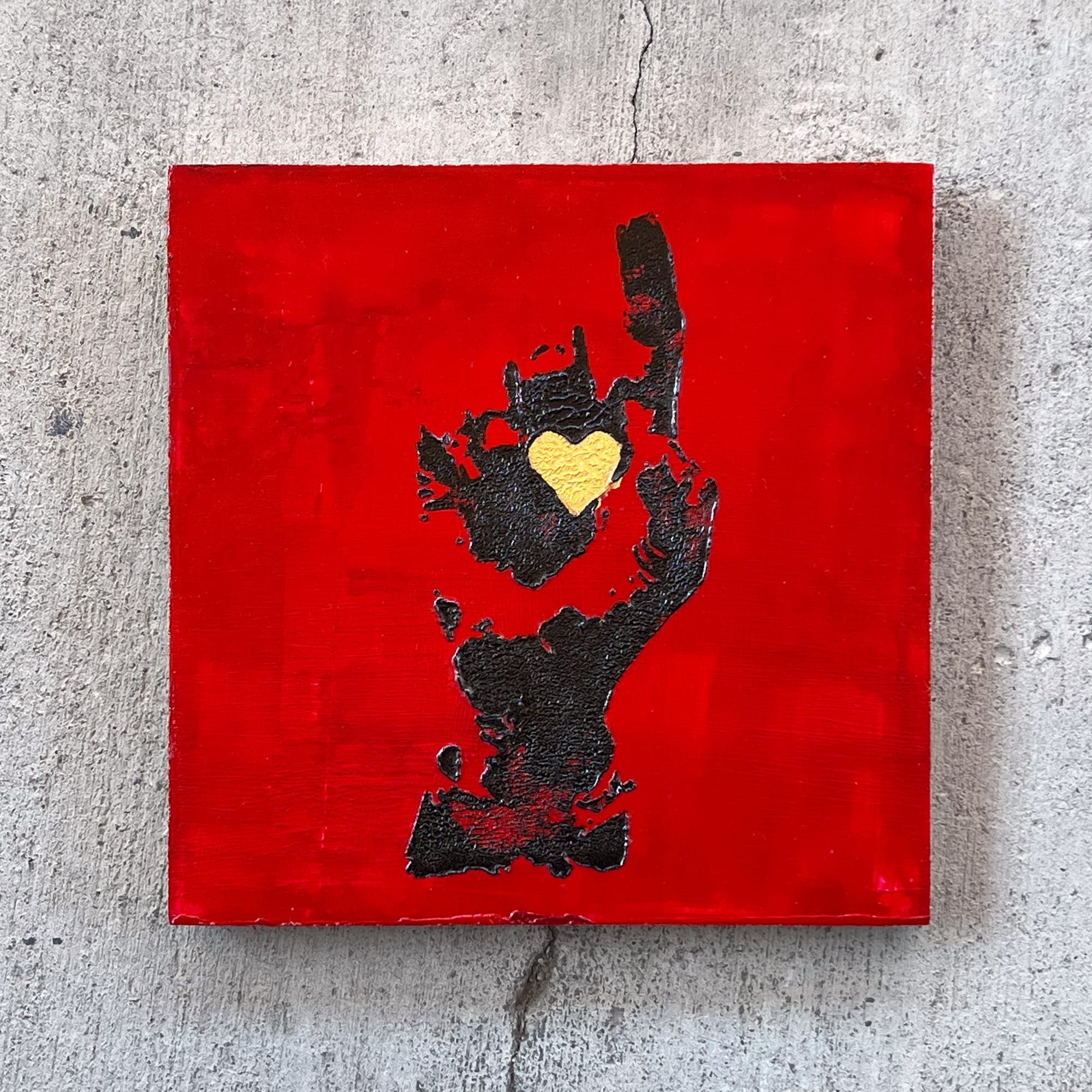 Love, Unsleeved takes that idiom and peels it back to something more raw — a gold heart suspended in a blackened hand, stripped of protection, suspended over a red field that hums between violence and passion. The piece borrows the language of urban graffiti — the imperfect imprint of the human touch, the permanence of emotion layered over impermanence itself.