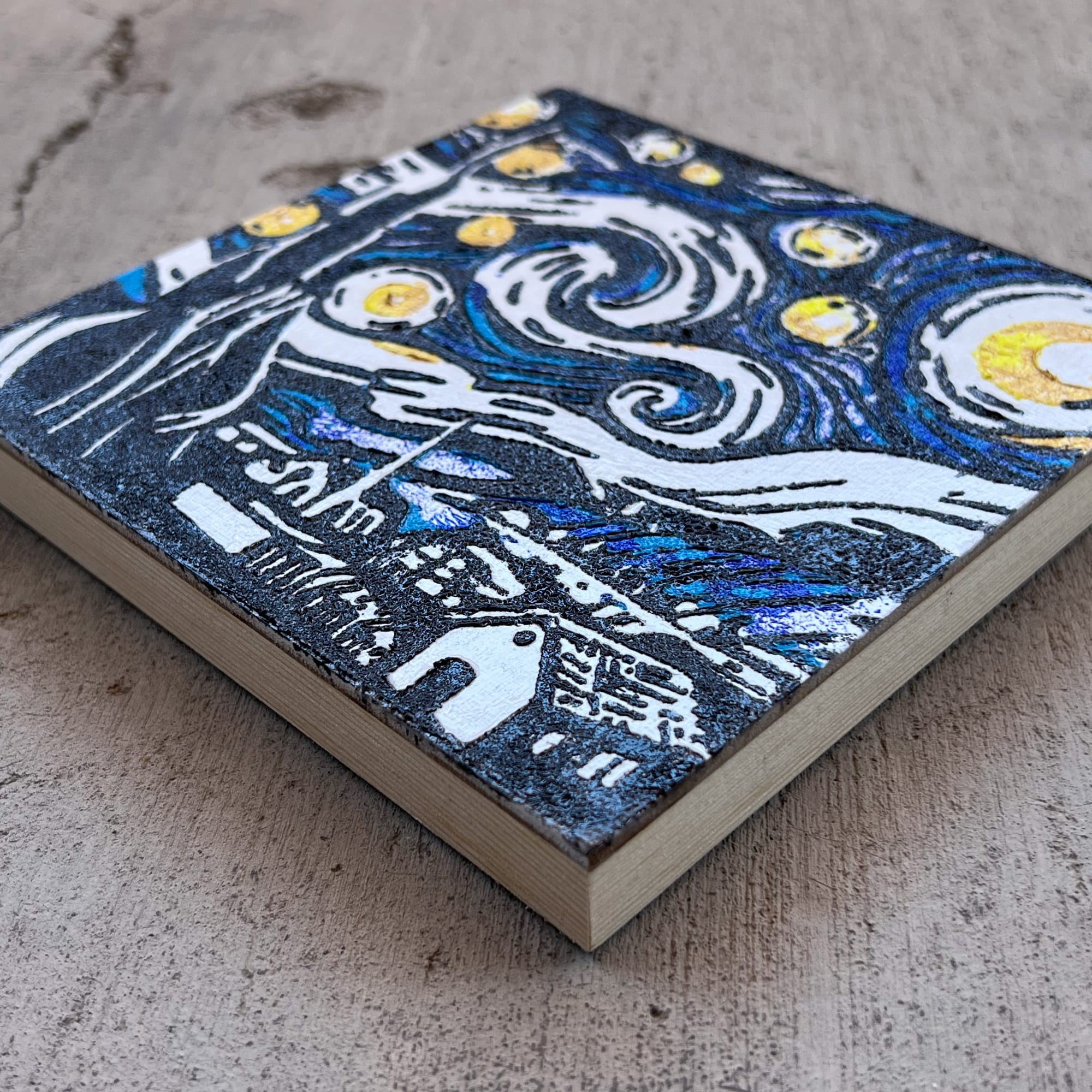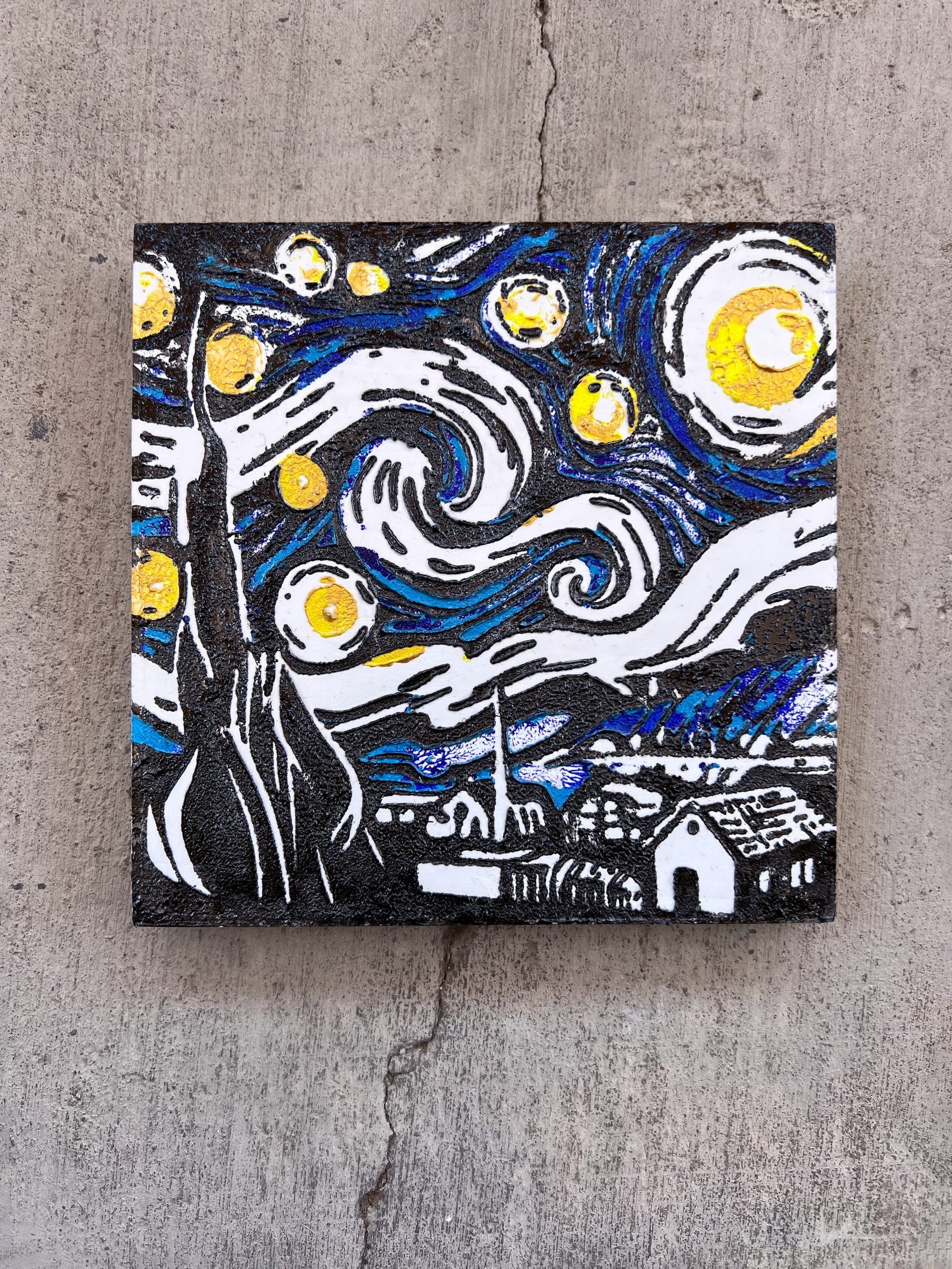 Starry Night Textured Painting – 6x6 Acrylic on Wood, Van Gogh Inspired Black & Gold Impasto Art