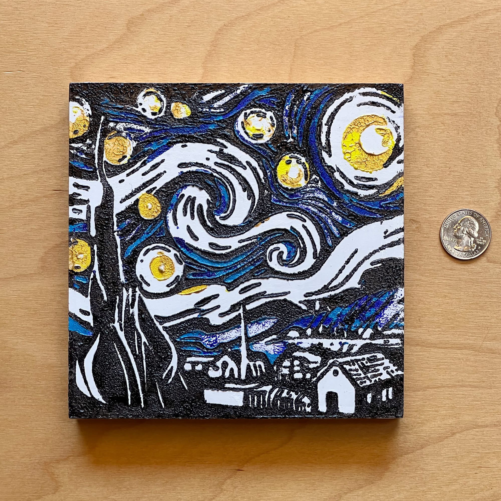 This Van Gogh inspired painting reinterprets one of the most famous works in art history—The Starry Night—through a bold, minimalist palette and sculptural impasto. Measuring 6 × 6 inches (15.24 × 15.24 cm), it layers black, gold, white, and blue acrylic into thick texture across a cradled wood panel. The result is both an homage and a contemporary reimagining: a small textured wall art piece that shimmers with metallic light while echoing Van Gogh’s enduring influence.