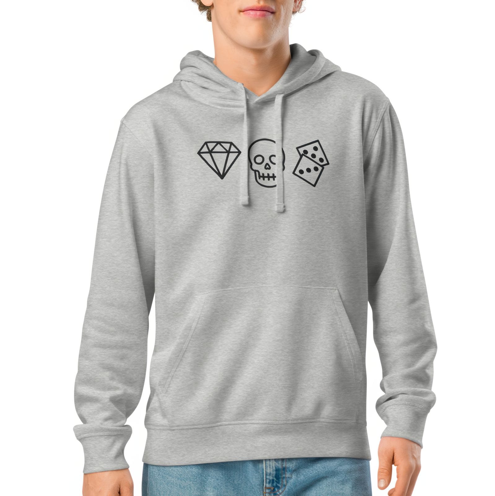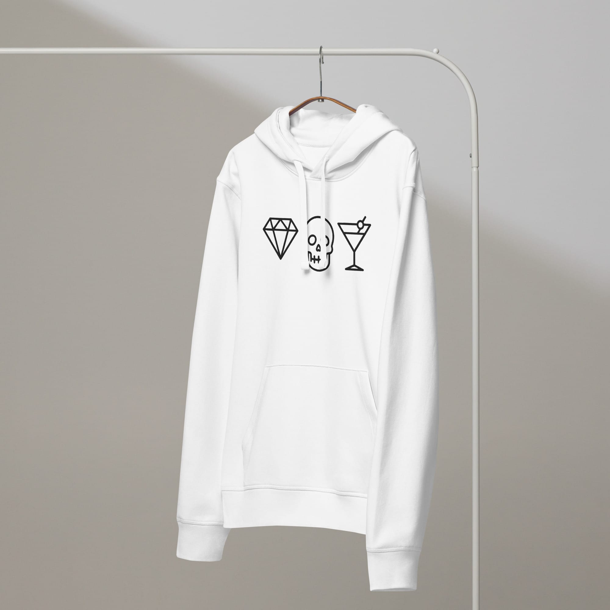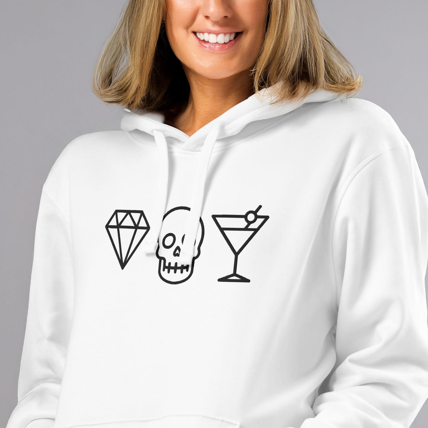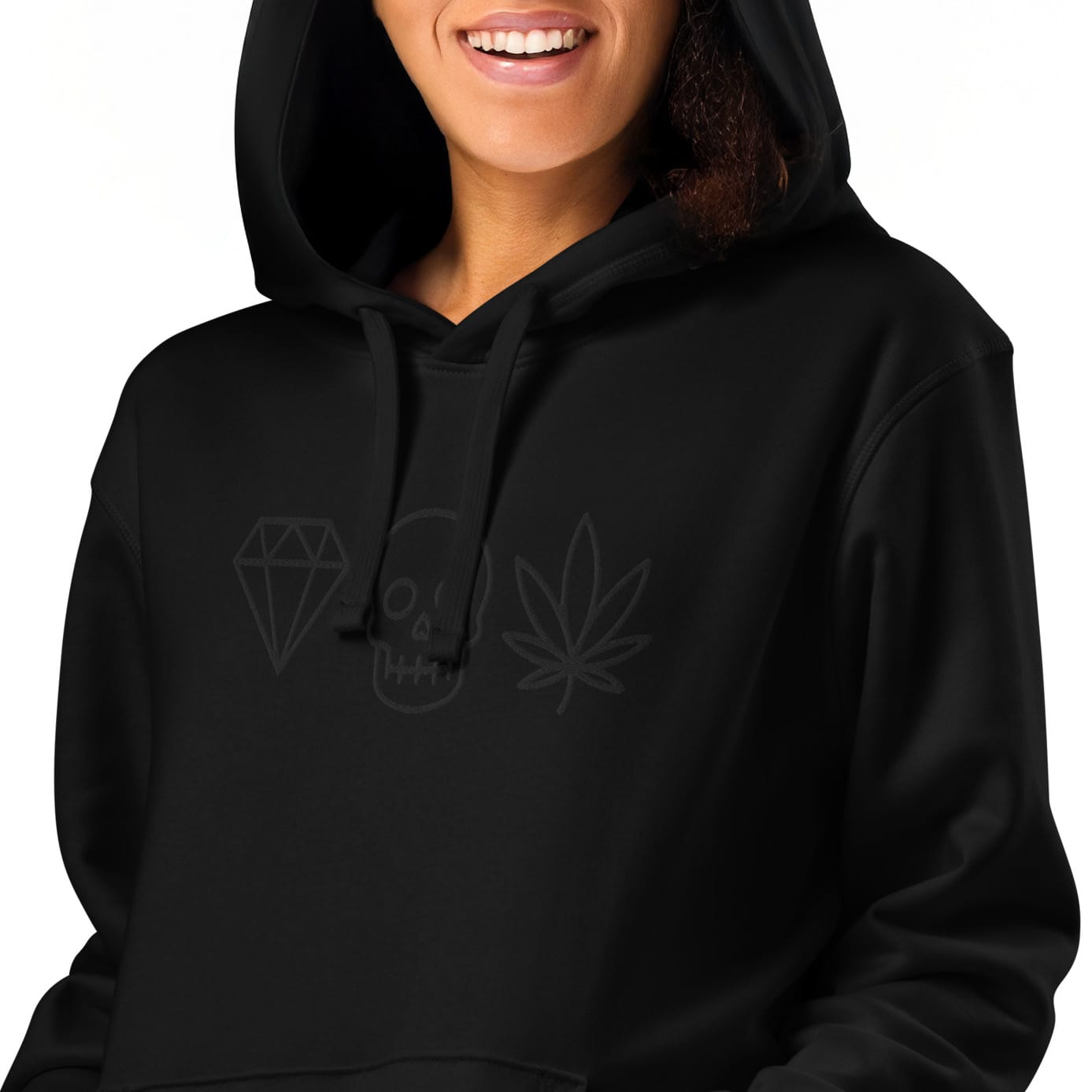 Unisex organic cotton hoodie in black or grey, sometimes white, with embroidered Diamond Skull and choice of weed leaf, martini glass, or dice pictogram — bold, industrial embroidery with sly nightlife vibe